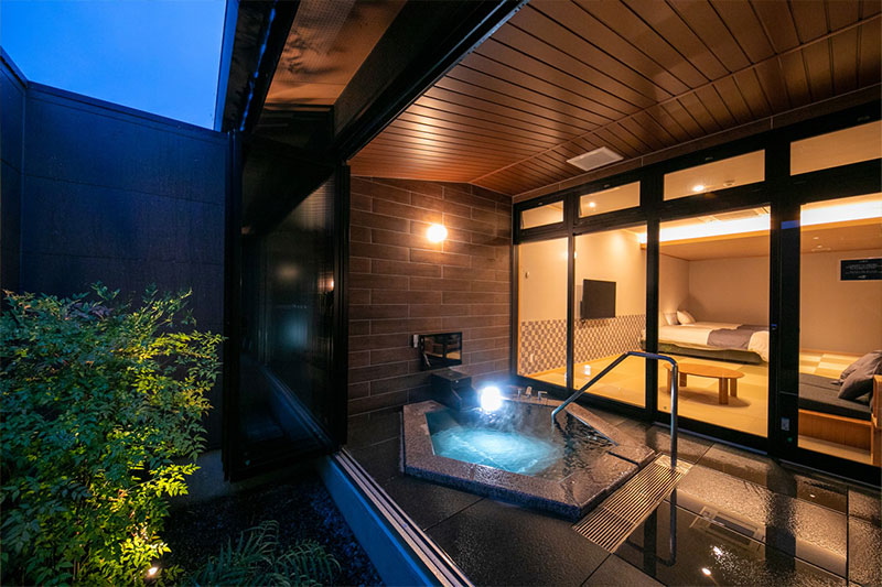 全室に半露天風呂を完備しておりますので、24時間100%天然温泉かけ流し湯をご堪能いただけます。ヌルヌル・トロトロの泉質はもちろん、多彩な浴槽を備えた大浴場もお楽しみのひとつ。ジェット風呂、うたせ湯、寝風呂とバラエティに富んだ湯をご堪能ください。